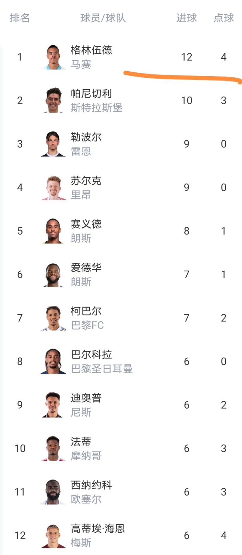 射手榜只有两名球员进球上双,看起来法甲也不是那么容易进球的。