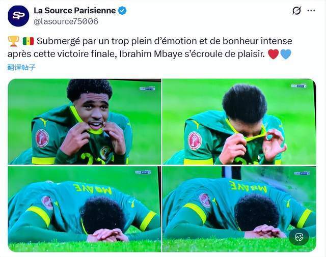 塞内加尔夺冠,17岁的小将姆巴耶趴在草坪上,用球衣遮住面庞。幸福降临那一刻,姆巴耶哭成泪人。