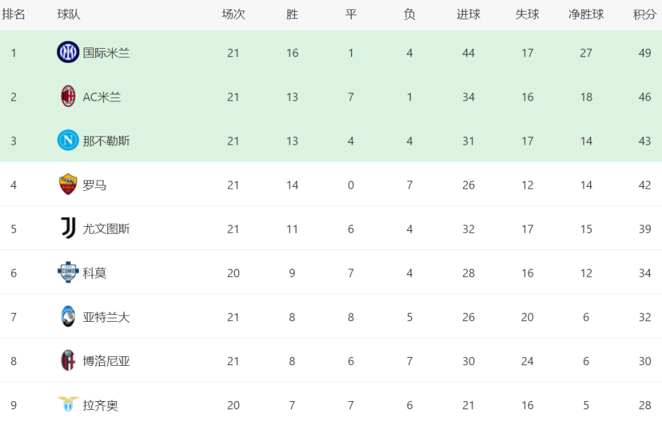 在积分榜上,国际米兰依然高居榜首,总积分是49分。而AC米兰赢球之后,总积分达到46分,排名第2,只比国际米兰少3分。卫冕冠军那不勒斯43分排名第3,依然有冲击冠军的希望。罗马3连胜之后,杀入了欧冠区,总积分42分排名第4。尤文图斯则掉到了第5名的位置,总积分是39分。科莫少赛一场,总积分是34分,排名第6。亚特兰大32分排名第7。博洛尼亚30分排名第8。拉齐奥只拿到28分,排名第9。