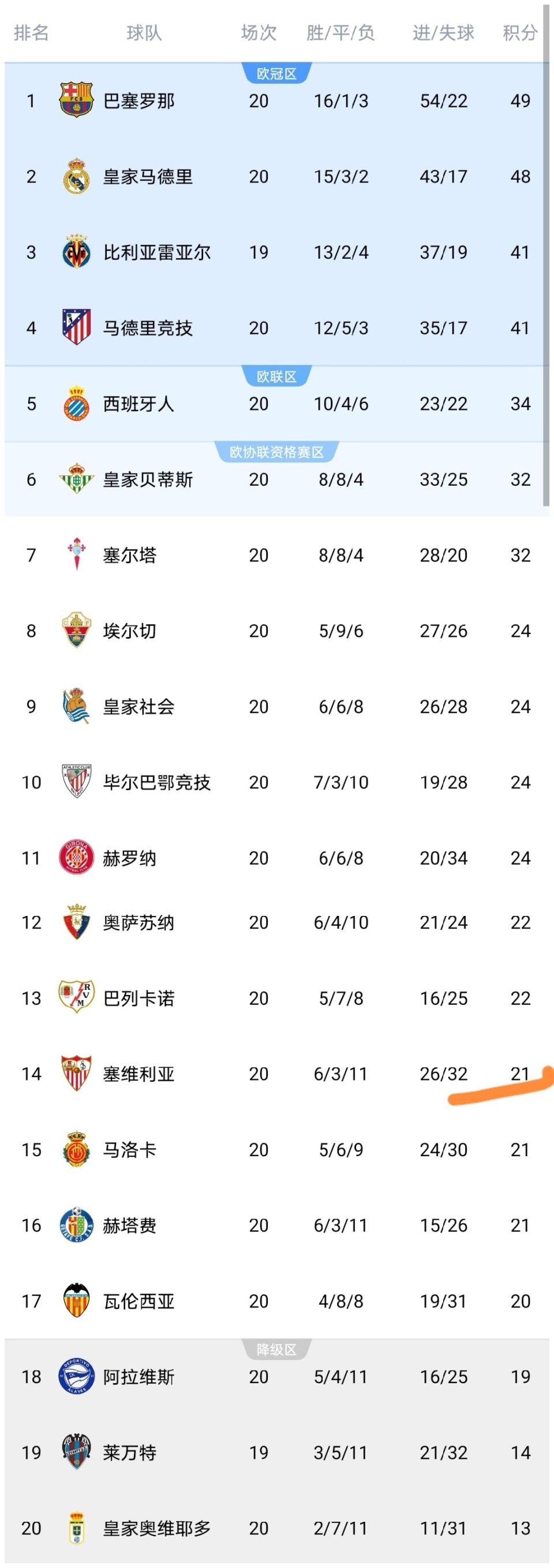 随着塞维利亚连扳2球2-2绝平,西甲最新积分榜出炉