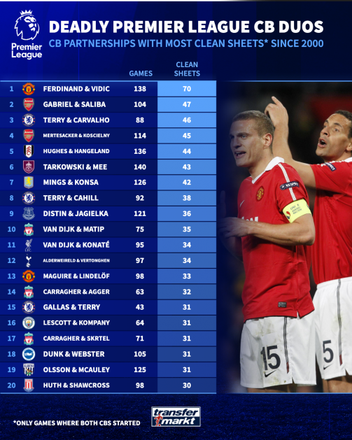 德转最近做了一次统计,把本世纪英超“零封场次最多”的中卫搭档全部拉出来排了个榜,结果一出来,信息量相当大。
