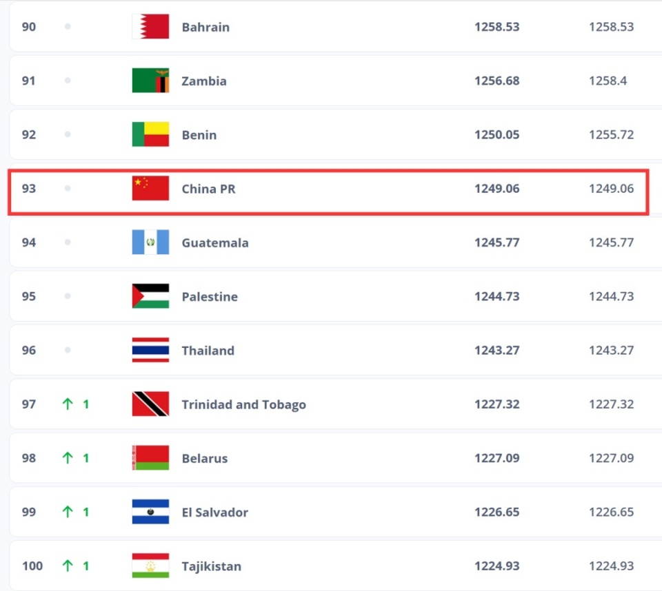中国男足继续排名世界第93位,亚洲第14位;西班牙排名世界第一、日本排名亚洲第一