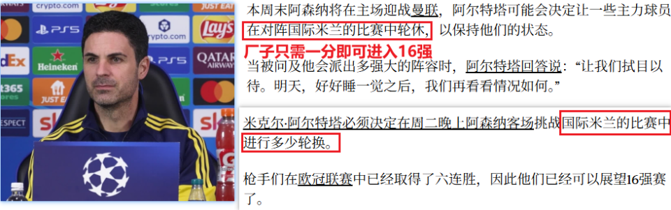 更关键的是,本周末阿森纳将在英超迎来与曼联的红魔之战。在联赛争冠进入白热化的阶段(目前虽然领先,但不能掉以轻心),塔子哥绝不会允许主力核心在无关痛痒的欧冠比赛中受伤。