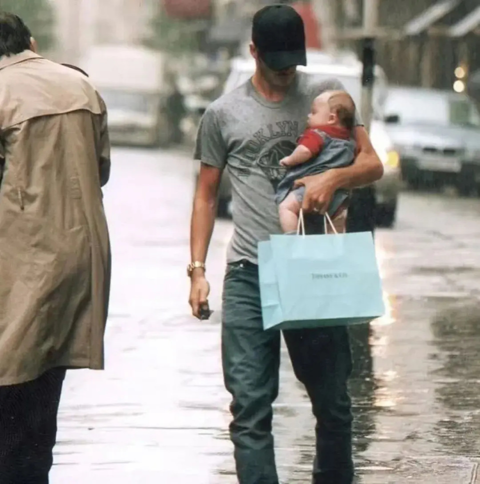 这是在2000年,贝克汉姆被人拍到一边照顾大儿子布鲁克林,一边还在给维多利亚购买蒂芙尼礼品。