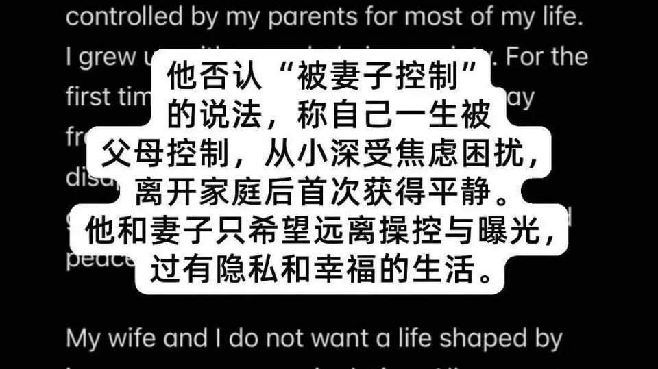 他否认自己“被妻子控制”的说法,称自己一生被父母控制,从小深受焦虑困扰,离开家庭后首次获得平静。他和妻子只希望远离操控与曝光,过有隐私和幸福的生活。
