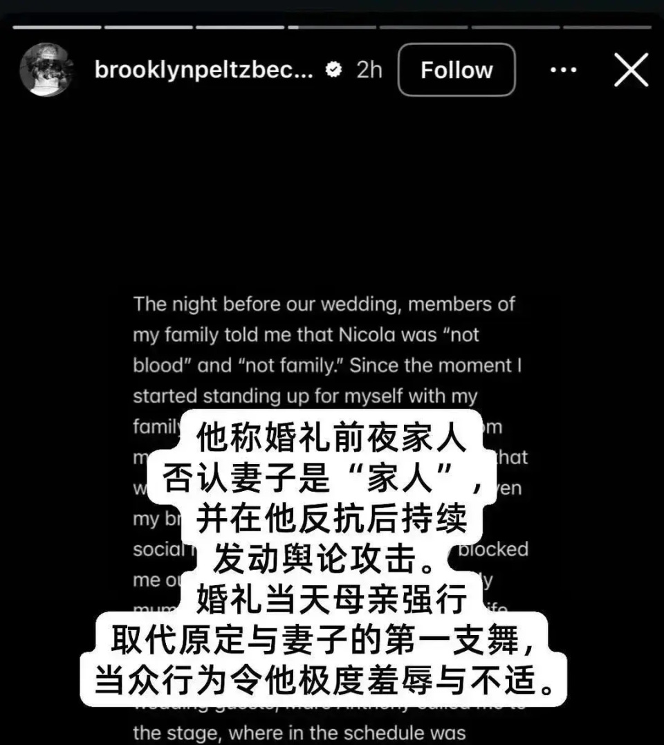 到底是为何要闹到决裂这一步?布鲁克林说了一些细节:父母在婚礼前后多次干预并破坏他的婚姻,维多利亚原本是要给儿媳设计婚纱的,可是却临时取消了,还逼他婚前签署放弃姓名权的协议,并因婚礼座次的安排辱骂他“邪恶”。