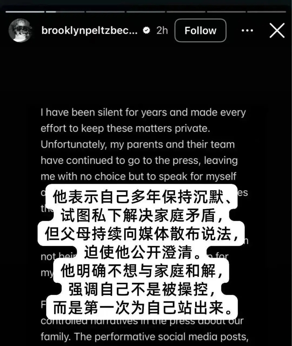 他表示自己多年沉默、试图私下解决家庭矛盾,但父母持续向媒体散布说法,迫使他公开澄清。他明确不想与家庭和解,强调自己不是被操控,而是第一次为自己站出来。