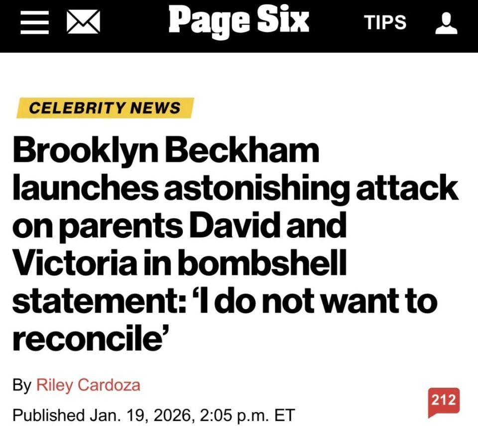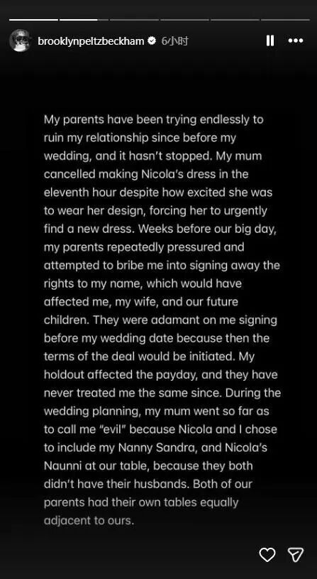 在一家人的矛盾闹到人尽皆知之后,据多家外媒报道,贝克汉姆(David Beckham)的大儿子布鲁克林(Brooklyn Peltz Beckham)在当地时间19日发文控诉亲爸亲妈。