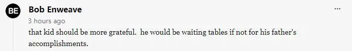 那孩子真该多些感恩之心。要是没有他父亲的成就,他说不定还在餐馆端盘子呢。