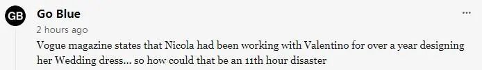 《Vogue》杂志报道过,妮可拉为了设计自己的婚纱,与华伦天奴品牌合作了一年多,那怎么会是最后一刻的灾难呢
