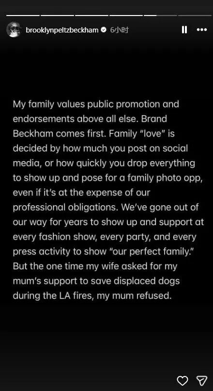 “家庭的‘爱’取决于你在社交媒体的发文数量,或者你是否能迅速放下手头的一切事务,赶过来拍摄全家福照片,哪怕这样做会损害我们的工作。”布鲁克林控诉,“多年来,我们一直竭尽全力出席每一场时装秀、每一场派对以及每一次媒体活动,以展示‘我们完美的家庭’。但有一次,我妻子请求我母亲在洛杉矶火灾期间支持救助流浪动物,而我母亲却拒绝了。”