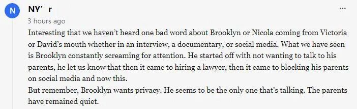 有趣的是,无论是在采访、纪录片还是社交媒体上,我们从未听到维多利亚或大卫说过布鲁克林和妮可拉的一句坏话。我们看到的反而是布鲁克林在不断博取关注:一开始他对外宣称不愿与父母交流,紧接着又曝出雇律师、在社交媒体拉黑父母的举动,如今又闹出这一举动。但别忘了,布鲁克林想要隐私。可似乎只有他在喋喋不休,他的父母始终保持着沉默。