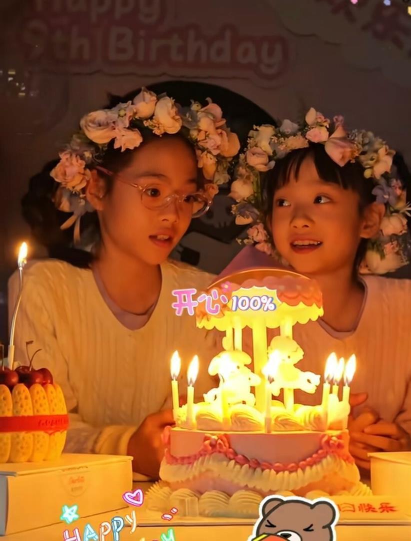 杨威和杨云这次真是下了功夫。 派对就在他们家宽敞的客厅里办的,根本不用去外面酒店。 头天晚上,夫妻俩就悄悄开始布置。 整个背景墙是蓝紫色的,全是气球,中间立着巨大的库洛米图案玩偶。 地上堆满了五颜六色的礼物盒,都是家人和朋友送的。 桌子上,一字排开摆了三个生日蛋糕,每一个都精致得不像话,插着小蜡烛。 欢欢和乐乐头上戴着白色的小花环,穿着可爱的小裙子,往气球墙前面一站,笑得眼睛都弯成了月牙。