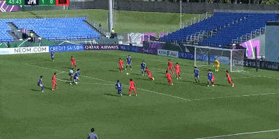 第44分钟,韩国后场解围不远,大禁区弧里的小泉佳弦凌空抽射稍稍偏出左侧门柱。