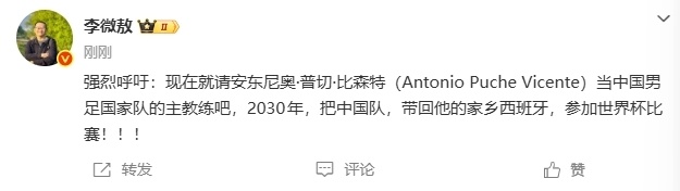 经济观察报首席记者李微敖更是强烈呼吁:现在就请安东尼奥当中国男足国家队的主教练吧,2030年,把中国队,带回他的家乡西班牙,参加世界杯比赛!