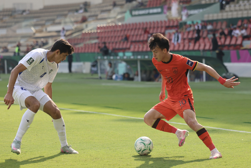 2026年1月17日,中国队球员王钰栋(右)在比赛中。 当地时间1月17日,在沙特阿拉伯吉达举行的2026年亚足联U23男足亚洲杯四分之一决赛中,中国队与乌兹别克斯坦队在常规时间和加时赛0比0战平。最终通过点球大战,中国队4比2战胜乌兹别克斯坦队,晋级四强。 新华社记者 王海洲 摄