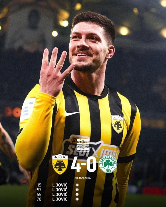01月20日讯 希腊超级联赛第17轮,雅典AEK4比0大胜帕纳辛奈科斯,赢得雅典德比。约维奇此役首发出战84分钟,在第15到78分钟连进四球,上演大四喜。