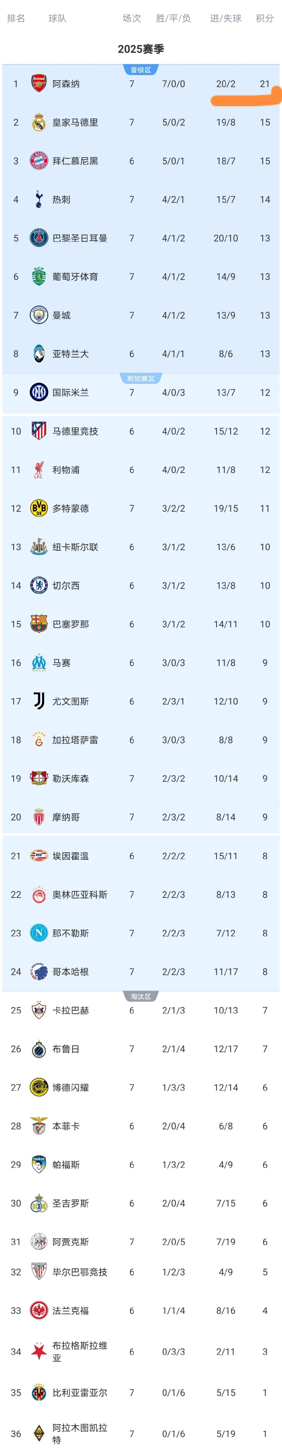 今天凌晨,欧冠联赛阶段第7轮结束多场较量,曼城、阿森纳、皇马等队出战,比赛之后,欧冠积分榜发生变化,我们来看看。