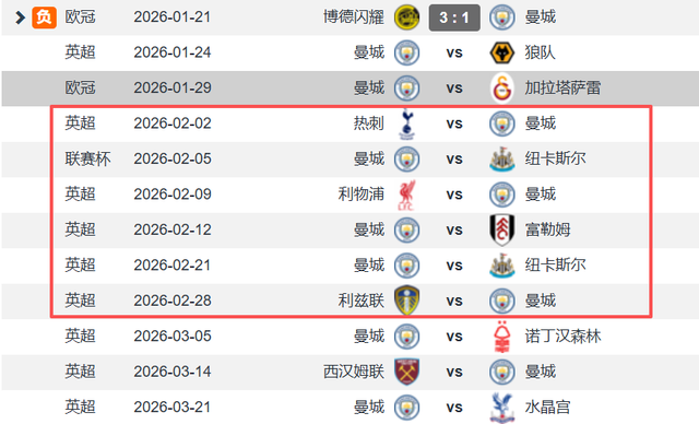 曼城目前四线作战,2月份英超有5场比赛,1场联赛杯半决赛次回合主战纽卡斯尔,足总杯第4轮主战索尔福德城,合计已经有7场比赛,若算是欧冠晋级附加赛两回合的比赛就是9场比赛。因此曼城能否获得欧冠前八对于未来赛程至关重要。以目前曼城的状态,欧冠第8轮主战加拉塔萨雷也未必全取3分吧!即使赢了,也要看其它球队情况,因为欧冠第7轮次日战罢,曼城大概率会跌出欧冠前八。瓜迪奥拉不断制造冷门,已经让曼城失去了强队的稳定性。