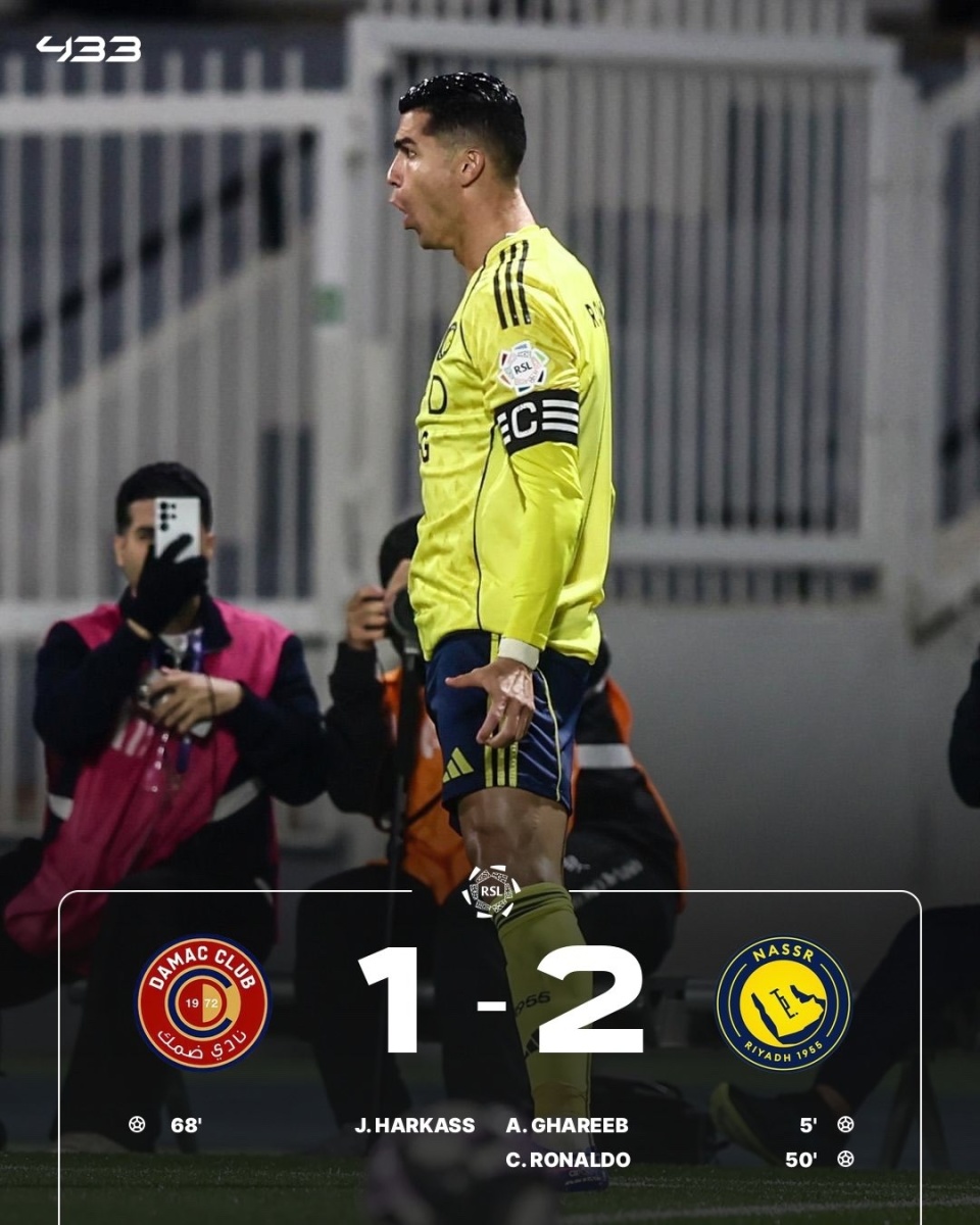 沙特联第17轮,利雅得胜利客场2-1战胜达马克,联赛两连胜,距榜首新月4分。加里卜首开纪录,C罗扩大比分,打进职业生涯第960球,菲利克斯助攻,哈卡斯扳回一城。