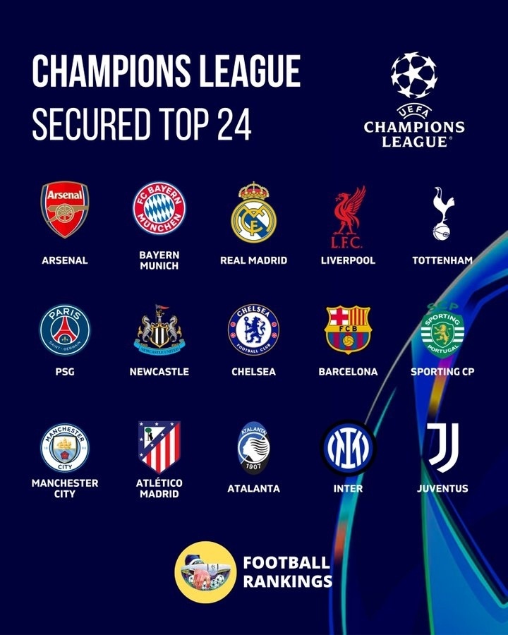 欧冠联赛阶段前八名球队将直通16强,9-24名球队进行附加赛。阿森纳拜仁确定进入16强,皇马、利物浦、热刺、巴黎、纽卡、切尔西、巴萨、葡萄牙体育、曼城、马竞、亚特兰大、国米、尤文至少确保附加赛。