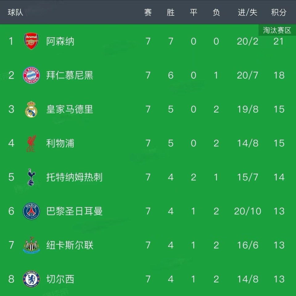 欧冠联赛阶段第7轮18场比赛已经全部结束,英超球队继续了在欧冠赛场的强势表现,本轮6支英超球队除了曼城爆冷在客场输给博德闪耀以外,其余5队全部获胜,且在本轮过后全部进入了积分榜前八名!目前排名积分榜前两名的阿森纳和拜仁已经提前晋级淘汰赛,并且锁定了前三名。前八名球队中除了阿森纳以外,另外还有利物浦、热刺、纽卡斯尔和切尔西,英超球队很有可能在联赛阶段结束后,占据前八名的半壁江山,直接晋级淘汰赛。