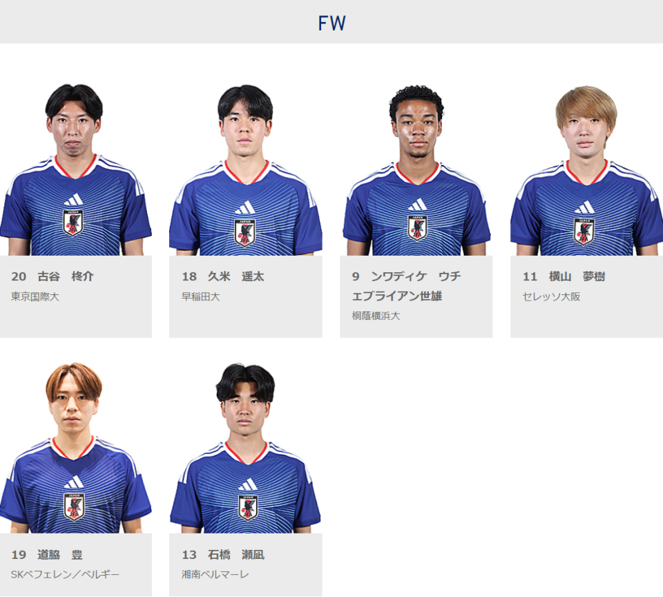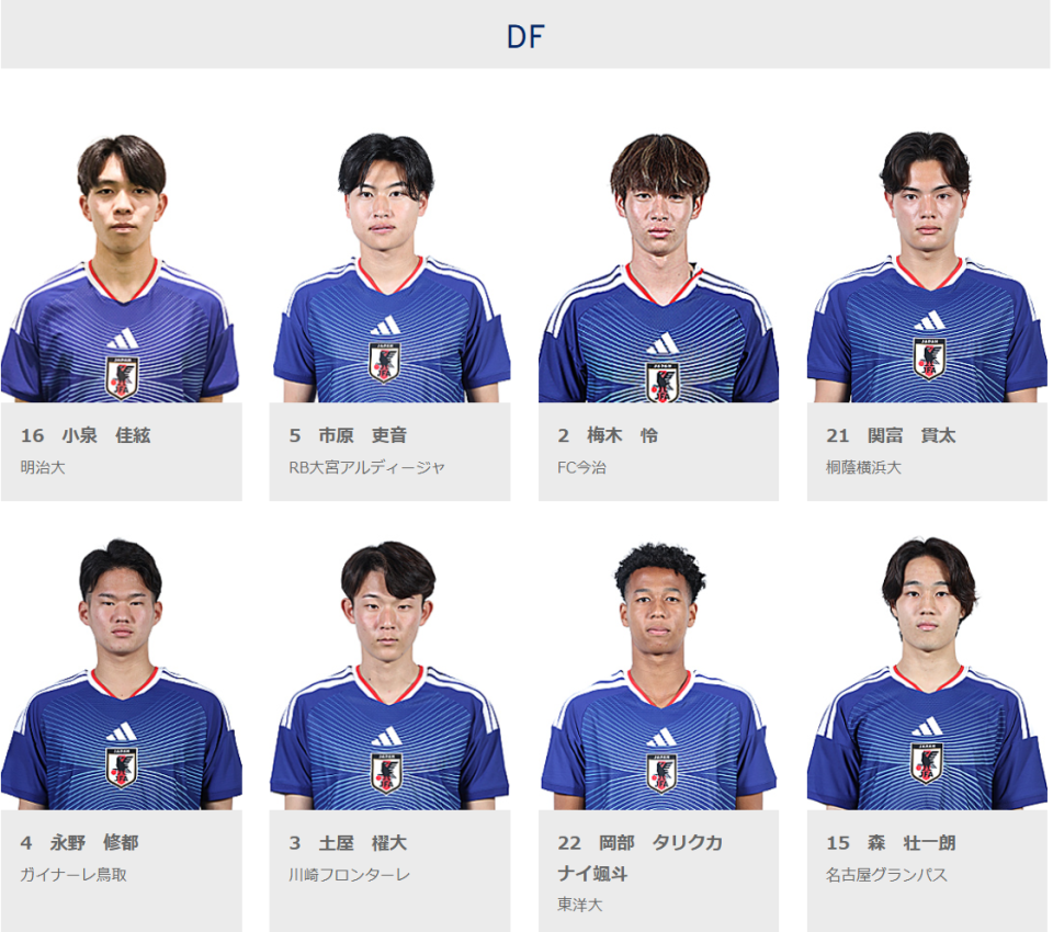 根据日本足协在去年底公布的U23亚洲杯名单显示,日本队23人名单中有门将滨崎知康(明治大学),后卫小泉佳弦(明治大学)、关富贯太(桐荫横滨大学)、冈部·塔里克卡尼·飒斗(东洋大学),中场小仓幸成(法政大学),前锋古谷柊介(东京国际大学)、久米遥太(早稻田大学)和恩瓦迪克·乌切·布莱恩·世雄(桐荫横滨大学)这8人。