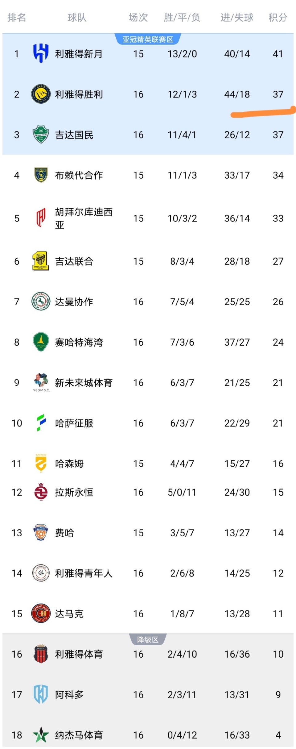 我们可以看到利雅得胜利队击败达马克之后,积分上涨到了37分并反超了争冠劲敌吉达国民队重新升到了第二的位置,并且仅距离榜首的利雅得新月队4分,利雅得胜利队继续给利雅得新月施压,保持争冠希望。而达马克输球后积11分排名第15,保级压力巨大。利雅得体育战平之后积10分排名第16,处于降级区,阿科多积9分倒数第二,也是处于降级区,都面临巨大的保级压力。而新未来城体育积21分排名第9,达曼协作积26分排名第7。
