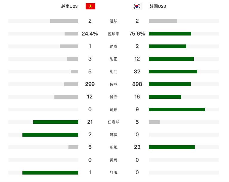 在北京时间1月24日结束的U23亚洲杯三四名决赛中,越南U23男足与韩国队在120分钟内踢成2-2。上半场,阮庭北助攻,阮国越小角度抽射破僵。下半场,金泰元替补登场一度为韩国扳平,阮庭北世界波助越南队再次反超,比赛尾声阮庭北飞铲染红,信敏河读秒绝平。加时赛,双方均无建树。