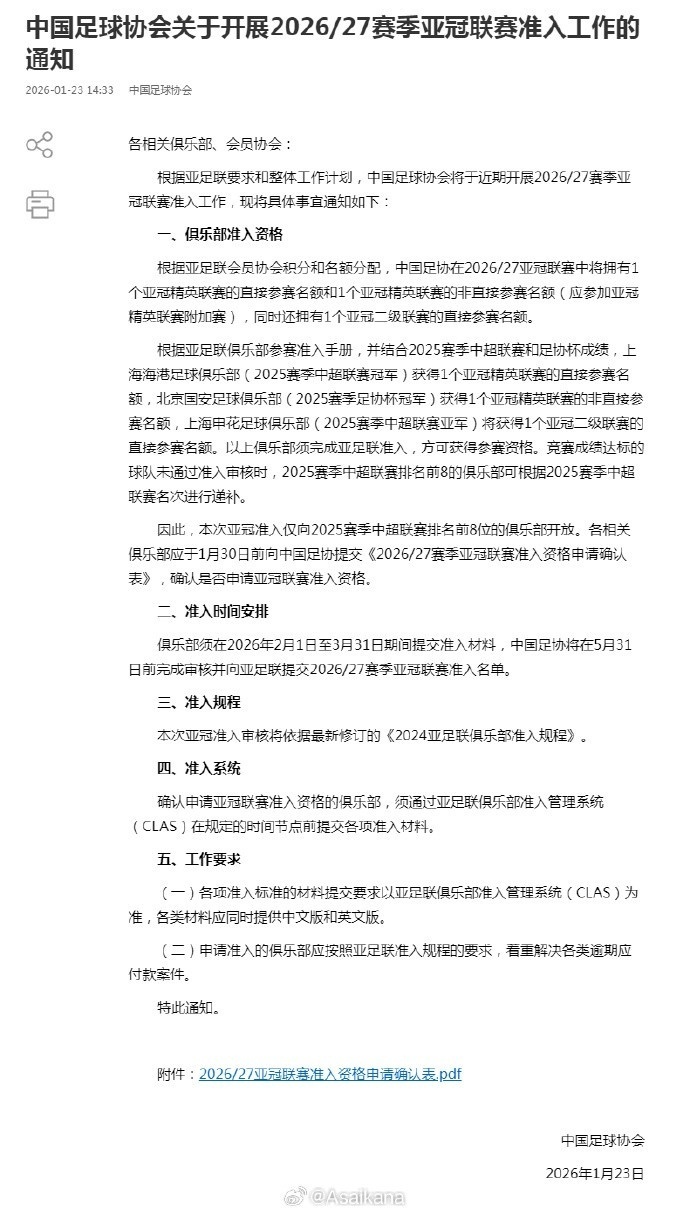 1月23日,中国足协发布通知,确认开启2026-2027赛季亚冠联赛准入工作。通知中,中国足协确认了下赛季中国足协有1+1+1个亚足联俱乐部赛事名额,上海海港、北京国安、上海申花此前已经分别获得了亚冠精英联赛、亚冠精英联赛附加赛和亚冠二级联赛的参赛资格。