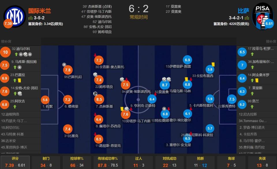 此役国际米兰遭遇开局黑,索默状态低迷,连丢2球,随后国际米兰开启让二追六的疯狂剧情。其中改变战局是迪马尔科比赛第34分钟换下恩里克,随后迪马尔科上演了2传1射满分发挥,赛后获得10分。国际米兰更是狂射34脚,多达6人取得进球,真是多点开花。最终,国际米兰6-2逆转大胜比萨,取得意甲争冠路上的宝贵3分,先赛的情况下6分领跑,牢牢占据本赛季意甲争冠的先机和主动权。