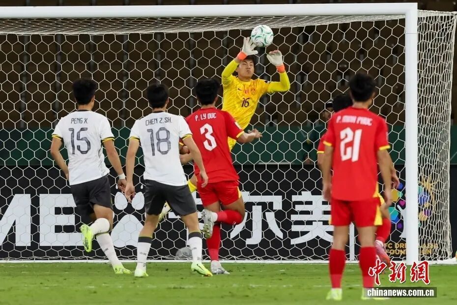 北京时间1月21日凌晨,在沙特阿拉伯举行的2026亚足联U23男足亚洲杯半决赛中,中国队3∶0击败越南队。图为中国队门将李昊在比赛中扑救。图/视觉中国