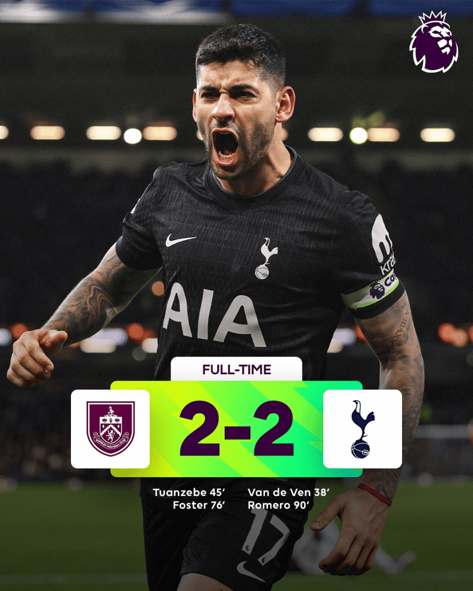 虎扑01月24日讯 英超第23轮,热刺客场2-2战平伯恩利。罗梅罗鱼跃头球,打入绝平球。