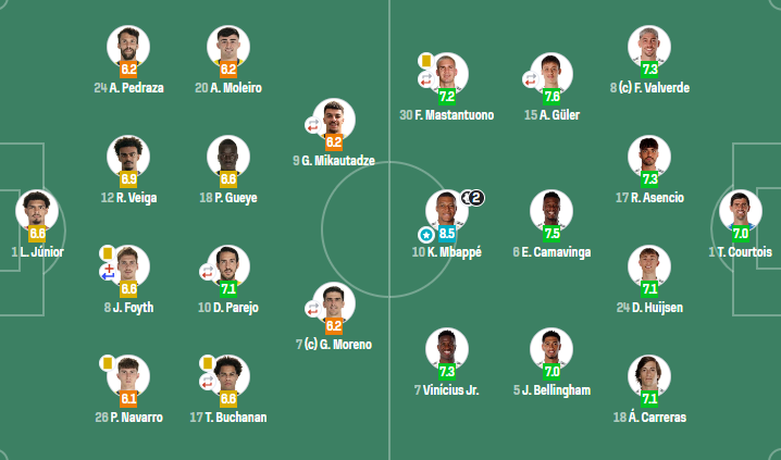 皇家马德里(4-3-3):库尔图瓦;巴尔韦德,劳尔-阿森西奥,赫伊森,卡雷拉斯;居莱尔(80'布拉欣-迪亚斯),卡马文加,贝林厄姆;马斯坦托诺(74'冈萨洛-加西亚),姆巴佩,维尼修斯