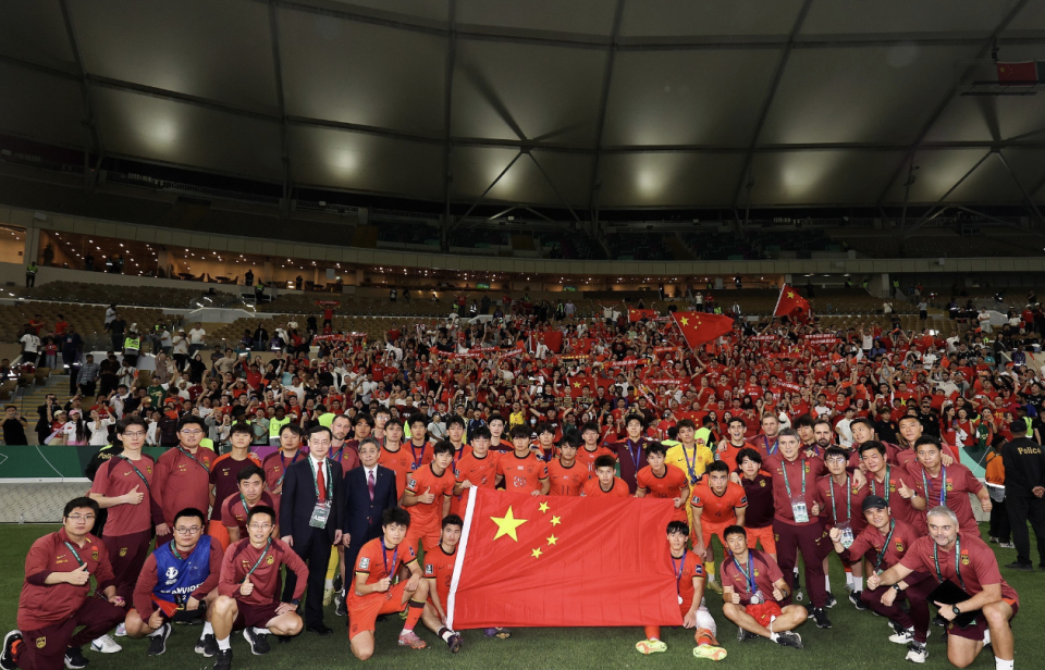 随后,中国队的球员们背对看台,和看台上的数百名球迷一起拍下了一张大合影。大伙儿挥舞国旗,感谢球员们在场上努力拼搏并创造了历史。