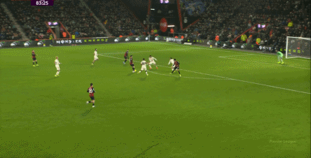 第84分钟,伯恩茅斯后场持球轻松打出反击,克里斯蒂带球突破到大禁区弧附近后送出斜塞,埃瓦尼尔森单刀球打门偏出左侧立柱。