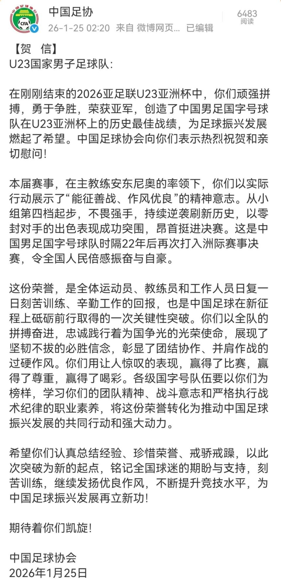 国家体育总局、中国足协第一时间致贺信。