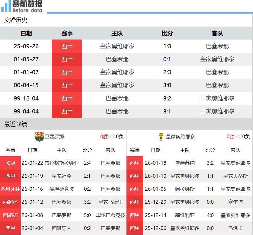 第一:两队情况!西甲20轮战罢,巴萨16胜1平3负积59分排名第二,落后先赛的皇马2分;皇家奥维耶多2胜7平11负积13分排名垫底,深陷降级区。上轮西甲,巴萨爆冷客场1-2不敌皇家社会,联赛九连胜被终结,巴萨输球并非踢得不好,而是运气太差,周中欧冠客场4-2轻取布拉格斯拉维亚;皇家奥维耶多客场2-3不敌奥萨苏纳,联赛13轮不胜。