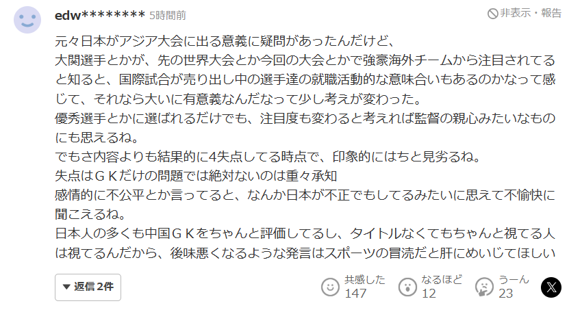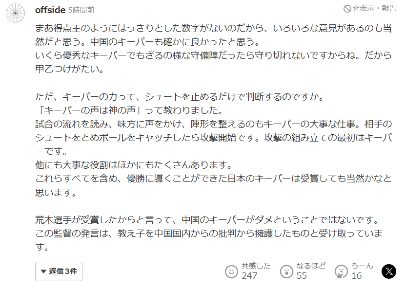 其实很多日本人也都在认真评价那名中国门将,就算没有拿到奖项,真正懂球的人还是会看得出来,所以希望能把这点牢记在心,那些只会让人留下坏印象的发言,本身就是对体育精神的亵渎。