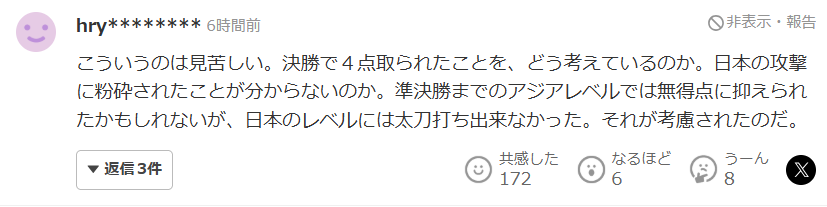 这种说法的吃相真的有点难看。决赛被进了4个球,到底怎么看待这个结果的?难道还没意识到是被日本的进攻彻底击碎了吗。