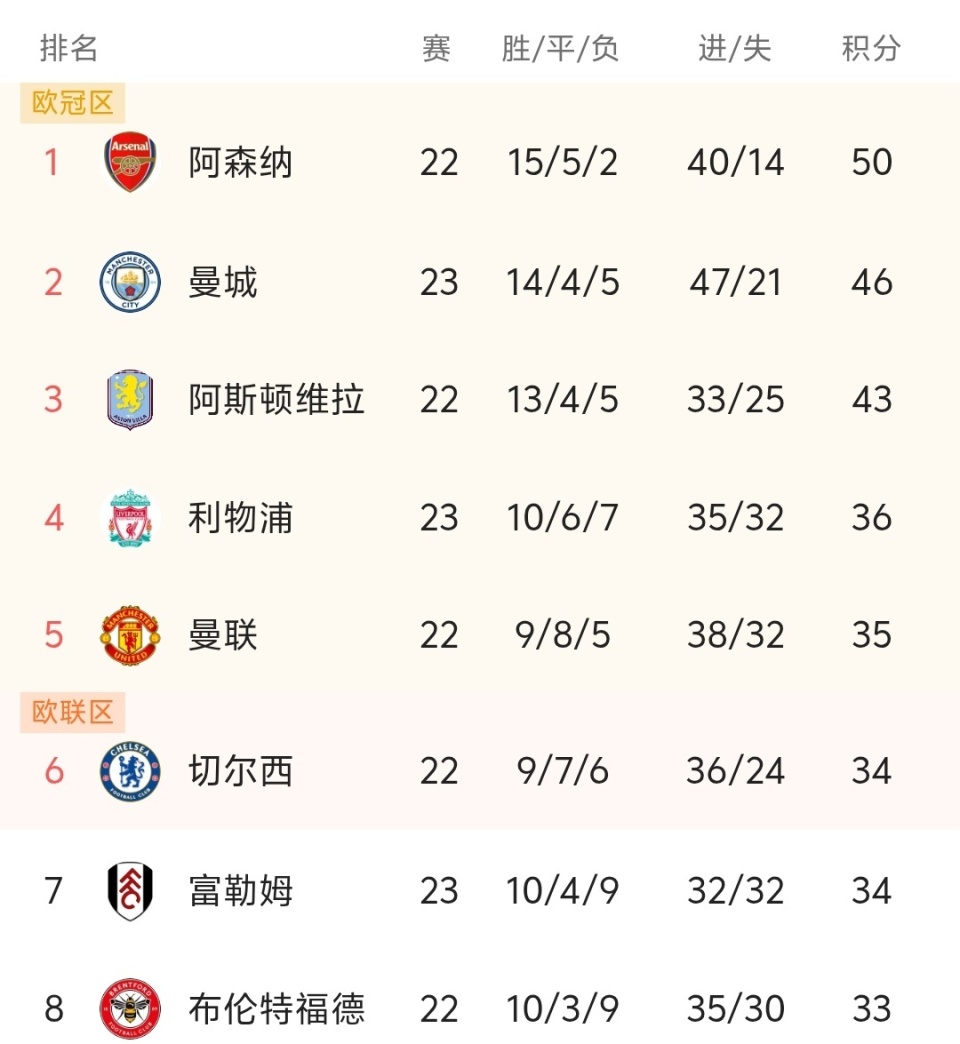 北京时间1月25日,英超联赛第23轮开打,已经结束的比赛,利物浦客场2-3惨遭伯恩茅斯绝杀,目前利物浦10胜6平7负积36分,仅仅领先身后的曼联一分,而且曼联净胜球比利物浦多,本轮只要曼联打平,就能超越利物浦排名联赛第4,现在曼联的局势真的好起来了,本赛季进步很大,留在前五就能踢欧冠了,这是非常振奋人心的事情,另外一场比赛曼城主场2-0击败了狼队,目前曼城落后领头羊阿森纳4分,不过曼城多赛一场,阿森纳优势依然很大!