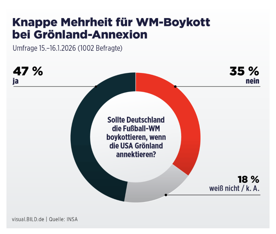 格特利希抵制呼吁在德国并不孤单。民调机构INSA公布的民调结果显示,如果美国总统特朗普真的吞并格陵兰岛,略占多数的受访者支持抵制2026年在美国举行的足球世界杯:47%的人表示“赞成”,35%的人反对抵制,18%的人表示不确定或未作答。