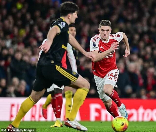 萨卡在禁区内将球挑起,厄德高凌空抽射,皮球打在马丁内斯身上变线入网。