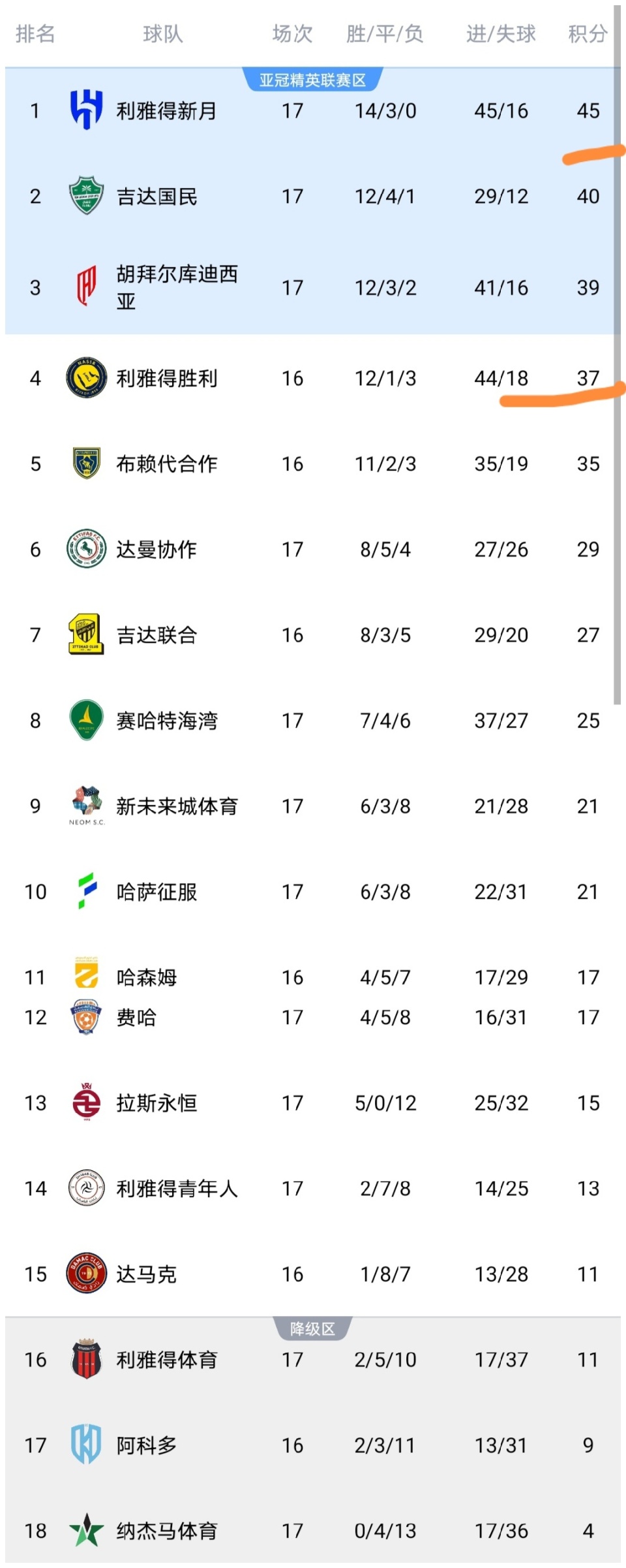 可以看到利雅得新月队被逼平之后积45分依然领跑,但是仅领先利雅得胜利队8分,而且还是多赛一场,如果本轮C罗领衔的利雅得胜利队取得胜利,那么利雅得胜利就会缩小跟利雅得新月队的分差,到时就仅差5分,那么利雅得胜利队争冠希望就依然很大。胡拜尔库迪西亚队取得胜利之后,积39分排名第3,暂时领先利雅得胜利。利雅得体育队积11分排名第16,保级希望大增,纳杰马体育继续垫底,哈萨征服积21分排名第10,费哈排名第12。