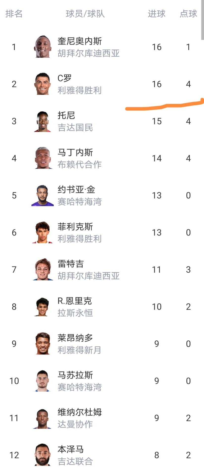 射手榜C罗被反超了,从射手榜榜首滑落到第二。C罗要努力啊,不然金靴就没了!