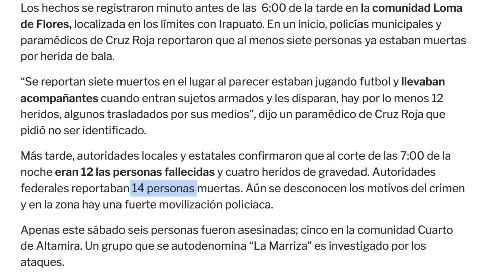 墨西哥当地政府通报指出,事发地点毗邻伊拉普阿托市的洛马德弗洛雷斯社区,出事的球场叫埃米利亚诺-萨帕塔体育中心。当时,该球场内正在举行足球赛和聚会活动。活动过程中,忽然有一伙武装分子闯入。这群武装分子至少有8个人,乘坐2辆车驶入球场。