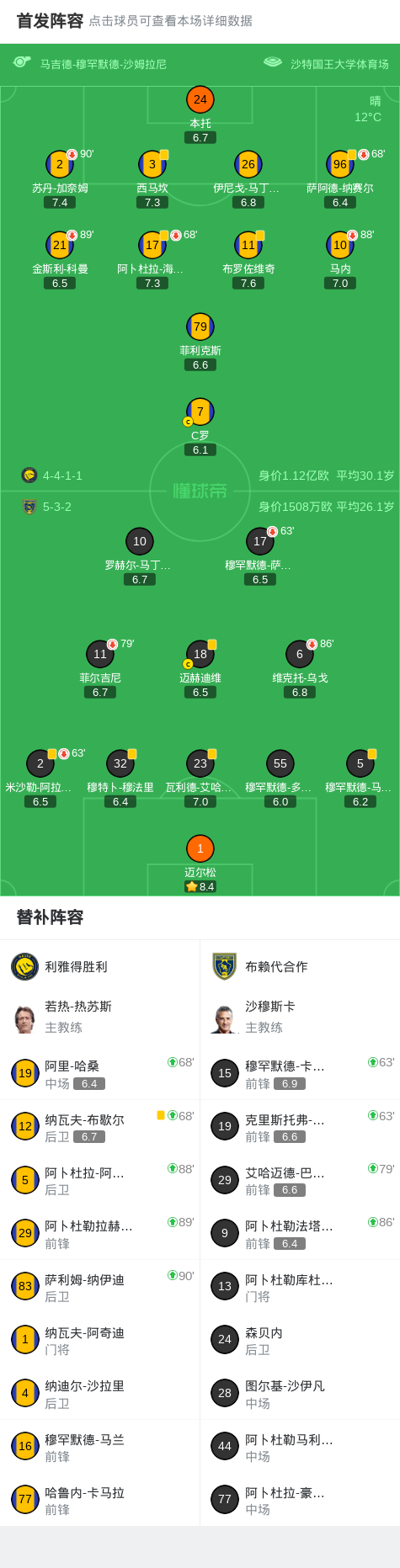 北京时间1月27日,沙特阿拉伯联赛第18轮,利雅得胜利主场迎战布赖代合作。上半场,C罗射门击中横梁。随后,西马坎和C罗的进球都因越位在先被吹。马内传中,多萨里自摆乌龙。下半场,马内射门击中立柱。全场比赛结束,胜利1-0击败布赖代合作,迎来3连胜。