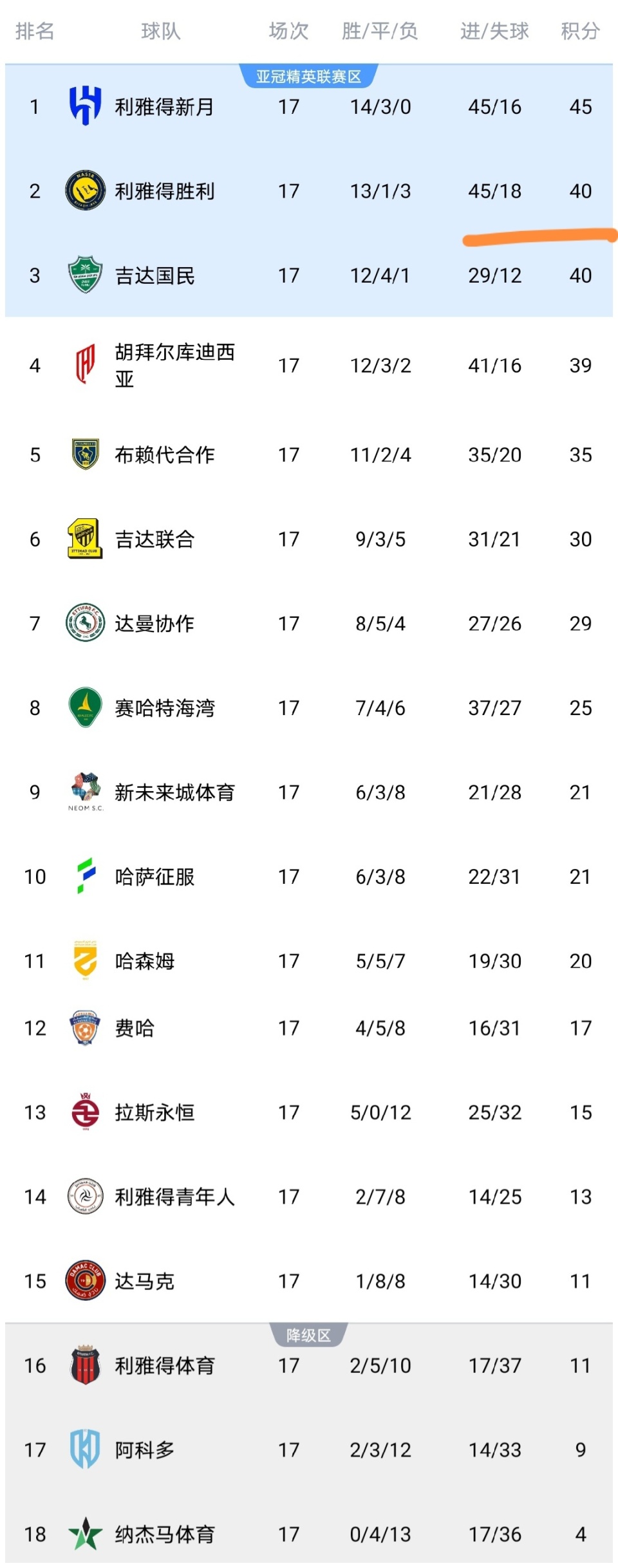 在C罗率队1-0击败布赖代合作队之后,利雅得胜利队积分上涨到了40分,排名也上升到了第二,然后仅距离领头羊利雅得新月队5分,可以看到利雅得胜利队依然有较大的争冠希望。而布赖代合作队输球之后积分停留在35分,继续排名第5,落后利雅得胜利队5分。而哈森姆赢球之后,积20分排名第11,领先降级区9分,保级基本稳了。达马克输球之后积11分排名第15,保级压力巨大。吉达联合击败阿科多之后,积分上涨到了30分,仍距离榜首的利雅得新月队15分,吉达联合争冠基本没戏,而阿科多队输球之后积9分排名倒数第二,保级任重道远。
