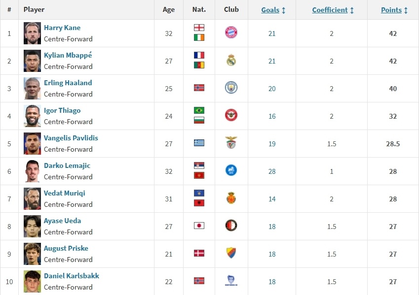 2026欧洲金靴争夺激烈 凯恩姆巴佩42分并列第1 哈兰德40分排第3