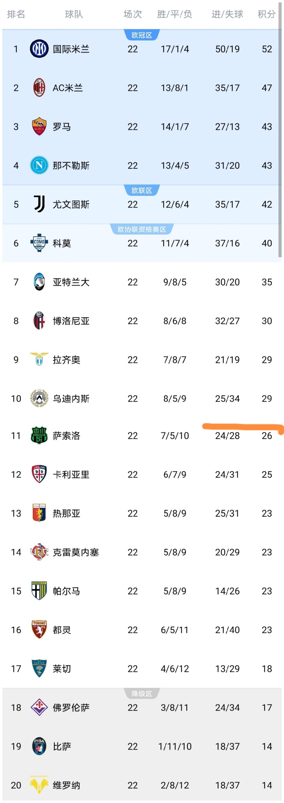 今天凌晨,意甲第22轮结束了最后一场的较量,乌迪内斯队出战,这场比赛之后,意甲所有球队都已经踢完了第22轮的比赛,意甲积分榜发生变化,我们来看看。